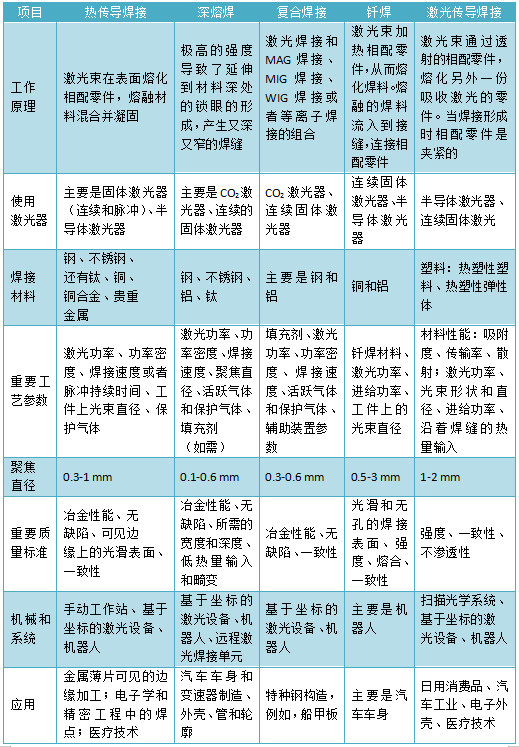根據(jù)工作原理的不同,適配不同的加工場(chǎng)景,激光焊接可分為熱傳導(dǎo)焊、深熔焊、復(fù)合焊接、激光釬焊和激光傳導(dǎo)焊接五種,具體如下:
