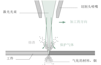 利用高功率密度激光束照射被切割材料,材料很快被加熱至汽化溫度,蒸發(fā)形成孔洞,隨著光束對材料的移動,孔洞連續(xù)形成寬度很窄的切縫,完成對材料的切割。